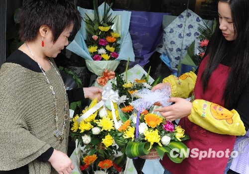 4月5日,清明节,福州市区花店用于祭扫的花篮花束生意红火。今年清明节“文明低碳祭祀”的观念为不少福州市民追捧,许多民众通过鲜花、绢花、卡片来表达追缅之情。中新社发 刘可耕 摄