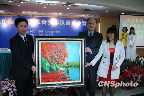 中国华文教育基金会在过去五年间,与21个机构合作实施项目32个,海内外直接受益人数将近五千人,涉及36个国家和地区。4月6日举行的“2010东南亚国家青少年汉语夏令营”开营仪式上,来自越南河内的代表向基金会赠送礼物,以答谢中国华文教育基金会对海外华文教育的支持。图为中国国务院侨办副主任赵阳(左二)和中国华文教育基金会副理事长兼秘书长雷振刚(左一)接受礼物。中新社发 张冬冬 摄