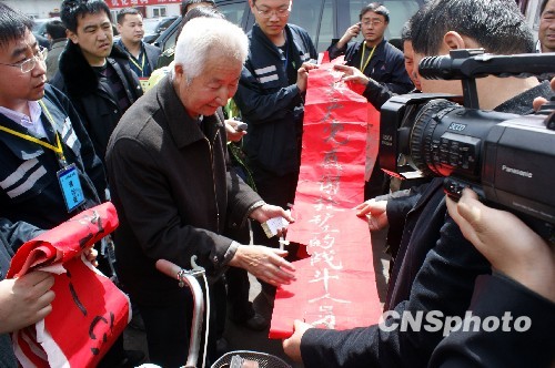 4月6日,一位山西河津市民将自己书写的一幅对联送到王家岭透水事故救援现场的救援人员手中,为被困工人祈福,并祝愿获救工人早日康复。中新社发 刘玉明 摄