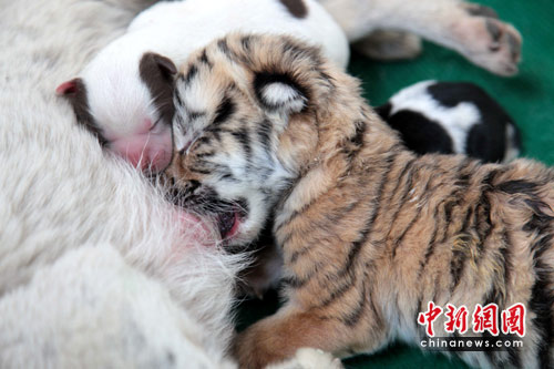 4月8日早七点,安徽合肥野生动物园在虎年迎来第一只“虎宝宝”。图为狗妈妈在给“虎宝宝”喂奶。中新社发 张娅子 摄