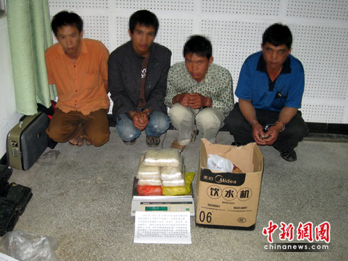 昆明市公安局禁毒支队近期内连续破获两起贩毒大案,共缴获冰毒28余公斤。图为被抓获的犯罪嫌疑人与缴获的10390克冰毒。中新社发 昆明市警方提供 摄