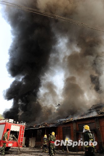 4月8日下午5时许,广西桂林市遇龙路一家塑料厂突发火灾,并向周围的洗涤车间和一家纸箱厂蔓延。接到报警后,桂林市消防支队调集11辆消防车和70多名消防官兵到场,及时堵截了火势向高温蒸汽锅炉蔓延,并救出了几名员工。中新社发 付兴学 摄