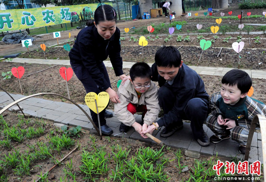 4月11日,家长带孩子在福州科技馆生态园“开心农场”开心种菜。福州科技馆生态园“开心农场”面积约3亩,种植有福州地区常见的60多种蔬菜类经济作物。该“开心农场”让市民亲自体验从播种、翻土、浇水、防虫害,到农作物成熟过程中每个阶段的劳作乐趣。市民们经过亲手照料成熟的果蔬,可采摘回家。现实版“开心农场”的出现不仅让人远离网络游戏,而且家长们带孩子前来可亲近自然,体验农家生活。中新社发 刘可耕 摄