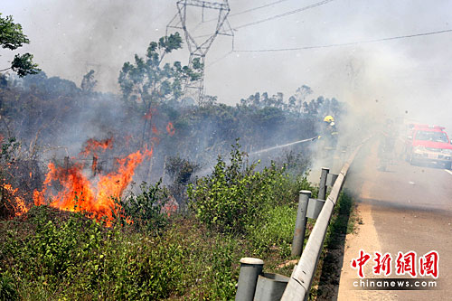 4月12日上午11时许,距离海南省海口美兰机场8公里处发生大面积山林大火,持续的干旱与大风将火焰吹到海口市绕城高速公路上,消防武警赶到现场开始扑救。中新社发 任晨鸣 摄