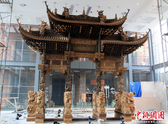 见证中西方文化交融历史的百年珍贵雕品“土山湾中国牌楼”,经过30多位中国工匠,历时7个月的修复,于4月12日在故土上海徐汇区复原亮相。该“牌楼”高5.8米、宽5.2米,1913年,在外国修士葛承亮的指导下,由上海土山湾数十位孤儿雕刻而成,仅雕刻部件就多达数千,举世罕见。之后,该牌楼参加过美国三届世博会,后又相继流落于美国、北欧民间。2009年,这座海外浪迹近百年的牌楼,以残缺不堪的模样重归故乡。中新社发 潘索菲 摄