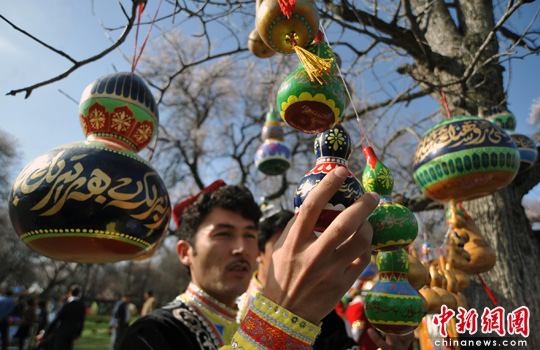 4月14日,2010首届新疆伊犁杏花旅游节在伊宁县举行,现场民间工艺展示区内制作精美的维吾尔民间彩绘葫芦令当地民众爱不释手。伊宁县是新疆著名杏乡,每年的4月中旬前后,当地果园内的杏花陆续绽放,鲜艳夺目,吸引大批观光客到此旅游。中新社发 刘新 摄