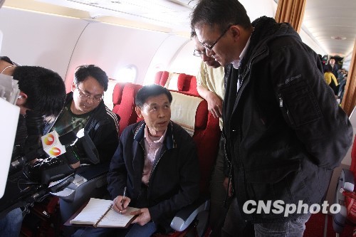 4月15日,在飞往青海西宁的航班上,广西省地震局专家在商量玉树地震灾区救援方案。中新社发 郭国权 摄