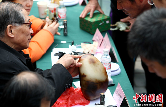 4月16日,潘家园旧货市场举办首期“大家来晒宝”活动,本期免费鉴定的主题为珠宝玉石类。大批的民众,带着自己的藏品前来让专家鉴别。据悉,该活动每月举办一次,时间定为每月的第三个星期五,上午9:00至11:00。中新社发 富田 摄