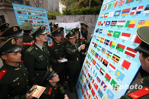4月18日,担负上海世博会开闭幕式、各馆开馆升降旗任务的武警上海总队国旗班围绕任务开展各项专勤专训,激发了官兵们履行忠诚使命,当好世博旗手的热情。图为官兵们在识别各国国旗。中新社发 张雷 摄