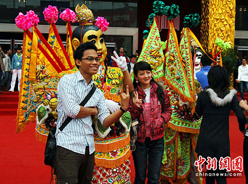 4月19日,在晋江国际鞋博会现场,观众高兴的与“电音三太子” 表演者合影。“电音三太子”是以民间传说三太子为原型,以台湾台客舞为动作基础编制而成,用电子音乐伴奏,哪吒三太子大神像随着音乐跳舞。这种艺术形式近几年在台湾地区比较流行。“电音三太子”刚从上海世博会试场地过来,大家在即将开幕的上海世博会上能再见到他们动人的身影。中新社发 张丽君 摄
