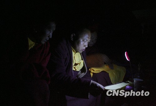 4月19日凌晨,西藏昌都尕玛寺长老在玉树县结古镇一地震受灾家庭为遇难者诵经祈祷。中新社发 苏丹 摄