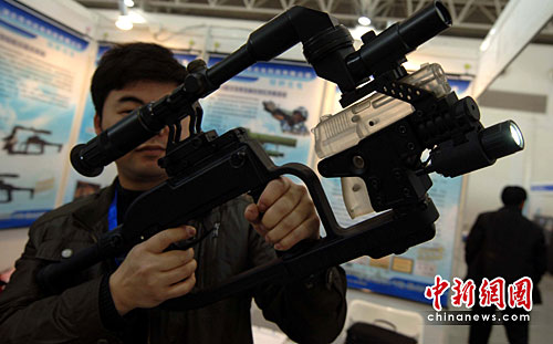 4月20日,2010年第八届北京国际社会公共安全产品与技术设备展览会展出三款中国制造的高科技含量的枪械。图为湖北华中光电科技公司生产的“自由边线射击战术系统”。中新社发 邹宪 摄