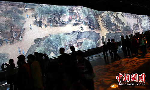 4月20日,上海世博会举行首场试运行。中国馆内投影到100多米长卷上动感版“清明上河图”引人关注。中新社发 汤彦俊 摄