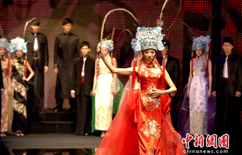 4月20日晚,首届海西国际时装周在福建石狮闭幕,本届时装周吸引了来自海峡两岸的纺织服装界企业家和知名服装设计师。期间举办了12场时装品牌和设计师作品动态发布会。图为模特展示古今潮流结合的服装。中新社发 王东明 摄