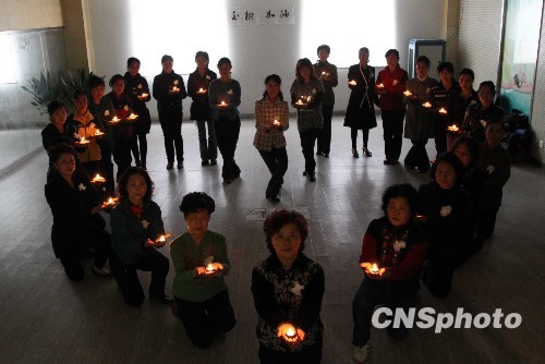 4月21日,江苏无锡太湖之音志愿者和江溪街道文化站的志愿者们举行“为青海玉树地震遇难同胞默哀”活动。他们点燃蜡烛,胸佩白花,向玉树地震遇难同胞致哀。中新社发 盛国平 摄