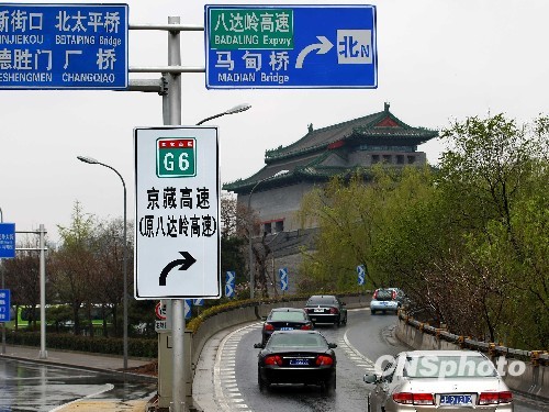 近日,包括京津塘高速、八达岭高速在内的7条从北京始发的高速公路开始更名和统一编号。除了更名外,还有一个最大的变化是高速路的出口编号由从高速起点按123顺序编排的方式,改为按照该出口所在高速路的实际里程进行编号。这些工作将在7月底前全部完成。图为北京第一块高速公路新旧名称对照信息板落户德胜门桥东北角,北京民众熟悉的“八达岭高速”将更名为“G6京藏高速”。中新社发 富田 摄