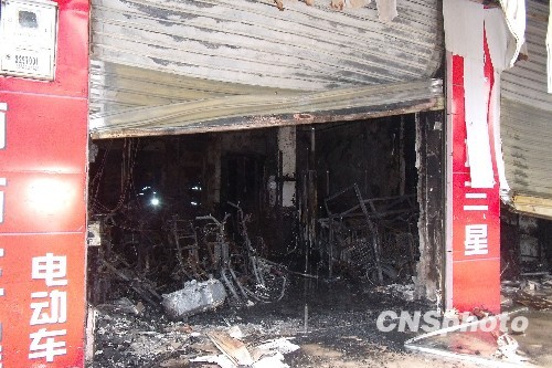 4月22日早上5时10分许,广东惠州市惠州大道小金口段兴隆街一销售电动车的商铺发生火灾,造成2人窒息死亡。火灾致一楼商铺的电动车和2楼、3楼的住房都被烧毁。店主已被警方控制。中新社发 严初 摄
