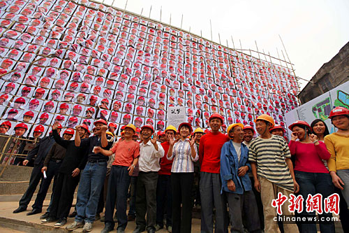 五一前夕,佛山市总工会与九鼎国际城联合举办“筑梦”大型活动,将参与城市建设的劳动者照片制作成海报,挂在他们正在建设的楼体外立面。中新社发 柯小军 摄