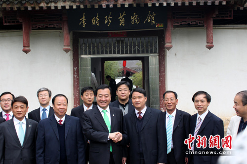 4月26日,经过韩国明星张娜拉牵线搭桥,韩国堤川市市长严泰永一行15人赴中国“医圣”李时珍故里——湖北蕲春县参观访问。韩国堤川市代表团参访了蕲春县的李时珍国际健康文化旅游区、李时珍纪念馆、李时珍国际医药港、李时珍医药集团等景区、企业。