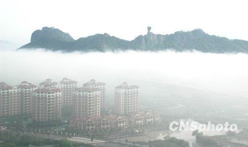 4月27日早晨,浙江温岭全城被浓雾笼罩,能见度极低。高大建筑被淹没在一片迷离之中,出现海市蜃楼般的梦幻景色。上午8时左右,浓雾才渐渐散去。 中新社发 江勇兵 摄