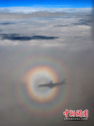 4月下旬,高空中的“佛光”奇观。日晕景观也称“佛光”景观,是阴沉天气,强烈阳光照射云雾表面后而形成的一种衍射现象,“佛光”的出现要阳光、地形和云海等众多自然因素的结合。中新社发 胡国林 摄