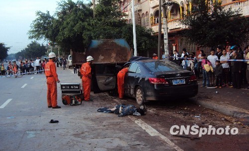 4月27日清晨,广西防城港东兴市发生3车连撞事故,造成一名骑自行车上学的学生死亡。消防官兵随后赶到现场,救出被困在小轿车中的司机。中新社发 曾春 摄