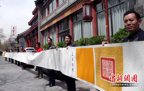 4月27日,由著名作家二月河担纲顾问,北京知名青年文化策划家屈金星撰文,著名书法家柳国庆、著名篆刻书法家李盛世书写的30米书法长卷《上海新赋》在北京琉璃厂装裱完成,为即将开幕的上海世博会献礼。中新社发 杜洋 摄
