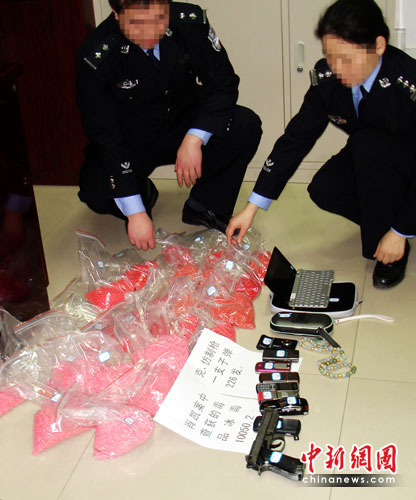 4月27日,重庆市公安局通报称,该市警方通过群众举报,历时半月将犯罪嫌疑人人赃俱获,抓获涉嫌贩卖毒品的犯罪嫌疑人3名,毒品冰毒片剂10052克(12万粒);钢珠枪1支,毒资10余万元人民币,彻底铲除一个附着在重庆主城各区高档娱乐场所里的“毒瘤”。据悉,这是重庆警方今年来破获的缴获毒品最多的一起贩毒案件。图为办案民警清理收缴的毒品和枪支等赃物。中新社发 张树明 摄