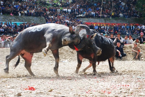 4月27日,贵州省第二届民族体育旅游节暨2010年贵州苗族姊妹节在贵州省台江县开幕,牛王争霸是此“两节”的一个活动项目,来自黔东南、黔南、铜仁等地的斗牛参加了竞技。中新社发 吴儒波 摄