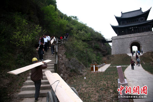 4月28日,四川剑门关景区工作人员将木板运往剑门关关楼,完成最后的关楼墙壁铺设工作。剑门关关楼在“5.12”汶川地震当日坍塌,工人历时14个月将关楼左迁近百米,回到明代时剑门关关楼所在位置,新关楼将于4月29日正式开关。中新社发 张浪 摄