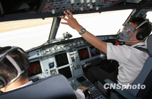 4月29日上午,国航西南分公司一架空客A319飞机从成都双流机场始发,成功地在青海玉树巴塘机场实施了RNP精密导航技术验证飞行。由此,国航成为继东航后第二家执飞玉树机场的民航公司,可随时执行成都、北京等地至玉树的救援运输专包机任务,极大提升玉树灾后重建的民航运输保障能力。图为玉树机场RNP试飞机组在着陆过程中佩戴上氧气面罩执行任务。中新社发 易世忠 摄