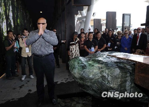 上海世博会新西兰馆4月29日在传统的毛利欢迎仪式中揭幕。古朴神秘的毛利舞蹈、粗犷高亢的唱诵祝福、象征彼此信任的碰鼻礼……新西兰人将欢迎尊贵客人的最高礼遇呈现给上海世博会,以隆重方式迎候世博游客。中新社发 陈婷婷 摄