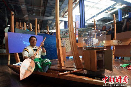 5月1日,一艘价值人民币4万元的独木舟亮相上海世博园纽埃国展区里。据了解,纽埃只有1398人口,但它却是世界潜水旅游胜地,这种用当地树木做成的独木舟,用于竞赛,在新西兰非常受欢迎。中新社发 潘索菲 摄