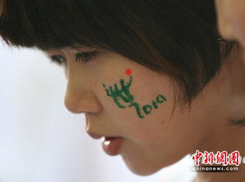 5月1日,在上海世博园排队的女孩,脸颊绘上了世博会的标识。中新社发 苏丹 摄