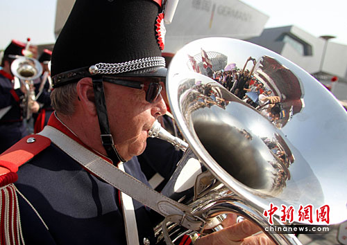 5月2日,世博会瑞士馆推出乐队演出,众多观众将乐队团团围住,拍照留念。中新社发 苏丹 摄