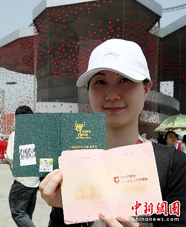 5月2日,上海世博园区内的各类纪念品销售十分火爆,尤其是能在各个场馆敲章留念的《世博护照》更是成为香饽饽。中新社发 汤彦俊 摄