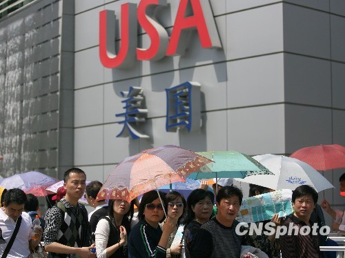 5月3日,上海世博会美国馆开馆。等待参观的观众排成了几百米长队,尽管需要等候3个半小时方能进入,但丝毫不减游客的参观热情。中新社发 苏丹 摄
