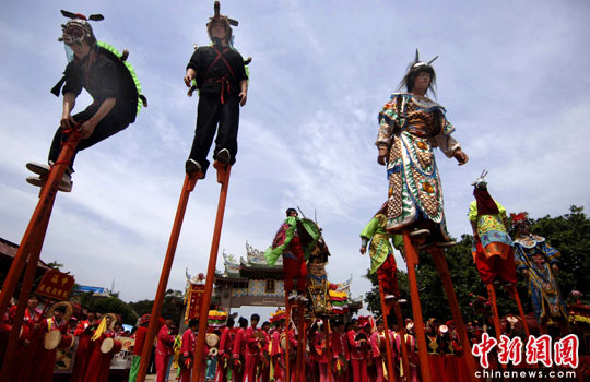 5月4日,福建湄洲岛高跷表演喜迎各地妈祖信众。当日,妈祖诞辰1050周年纪念活动在湄洲岛启动,适逢妈祖诞辰千秋寿诞大庆,湄洲岛妈祖祖庙将举行一系列庆祝活动喜迎节日到来。中新社发 王东明 摄
