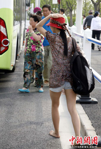 5月4日下午,为了在上海世博园内多看一些展馆,一位美女不惜在园区内赤脚行走。中新社发 潘索菲 摄