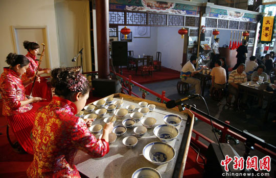5月4日,上海世博会北京周启动,微缩版的老舍茶馆亮相世博园区,32个大茶碗组成的“碗琴”演奏着《故乡是北京》,令人耳目一新。中新社发 潘索菲 摄