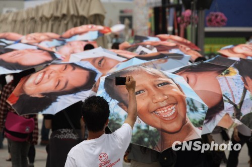 5月4日,世博会第四天,来自上海市高校的100名大学生,在世博园区撑起成片的笑脸伞。灿烂的笑脸来自四川地震灾区和印度海啸灾区的儿童,表达上海学子祈福明天更美好的心愿。中新社发 张雷 摄