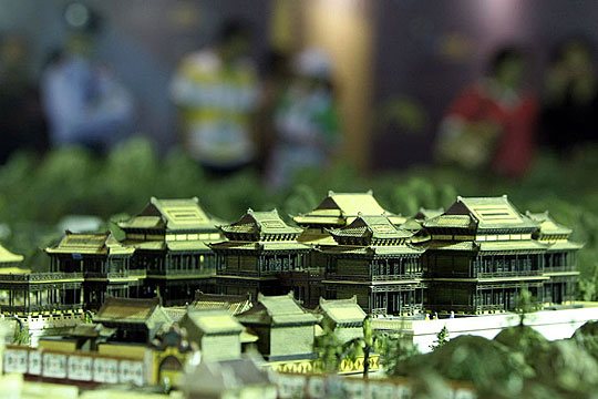 5月4日,游客在参观缩微版“圆明园”。近日,一座“全景式巨型立雕圆明园”在上海世博会世界贸易中心协会馆亮相。这座缩微版的“圆明园”以1比150的比例制作而成,再现了全盛时期的圆明园雄伟壮观的全景。
