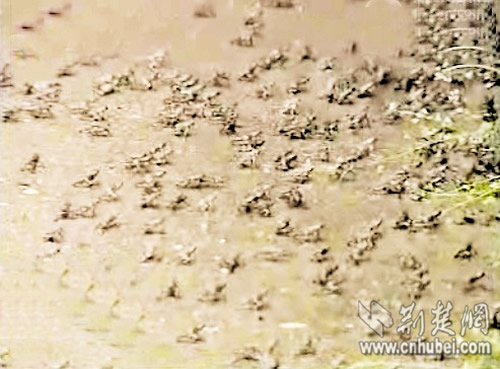 据最先发现的一位女村民说,当晚,天空中还飘着蒙蒙细雨,无数土青蛙集中到该村近200米的路面上,并且不断有土青蛙从路边沟里跳出来加入。它们的头都朝上,整齐划一地前进,场面十分壮观(如图)。这些青蛙身长两三厘米,相当于成人的大拇指大小。