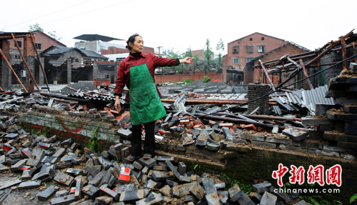 5月6日,重庆市垫江县城外路边一家小店老板家的院墙在凌晨的大风暴雨中被吹倒。自5月5日夜间开始,重庆各地出现一次明显的降温降雨并伴随大风冰雹天气过程。截至6日7时,该市有7个乡镇达大暴雨,46个乡镇达暴雨,其中涪陵区李渡镇最大降雨量达146.7毫米,其余大部地区出现中雨以上降水。截至6日上午10时30分,灾害共造成重庆26人死亡(其中垫江县死亡19人、梁平县死亡6人、涪陵区1人)、152人受伤。中新社发 郭晋嘉 摄