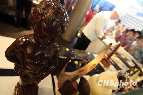 5月6日,在上海世博会比利时馆的“巧克力角”,巧克力大师现场献艺向游客展示比利时巧克力的制作过程,吸引了众多游客驻足欣赏。中新社发 汤彦俊 摄
