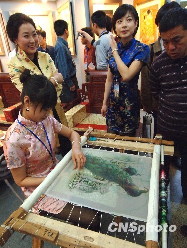 5月6日,由中国建筑装饰协会等部门主办的“2010年第五届中国国际设计艺术博览会”在北京展览馆开幕。该展包括国际优秀设计作品、全球创新设计作品、设计选材推荐、建筑装饰设计佳作、家居配饰设计佳作及工业设计等各大创意设计专业展览。图为正在刺绣的《孔雀》苏绣售价达到7万元人民币,作品需要一年半的时间精心创作。中新社发 邹宪 摄