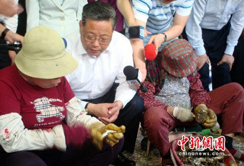 5月9日,正率团在台访问的福建省长黄小晶(中)在台南市参访路上,下车走进路边人家,与正在剥海蛎的妇女亲切交流。黄小晶5日率福建省经贸文化交流团抵台展开为期6天的“走亲访友做生意”之行。中新社发 罗钦文 摄