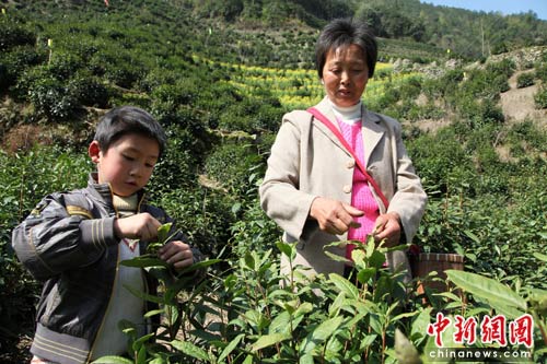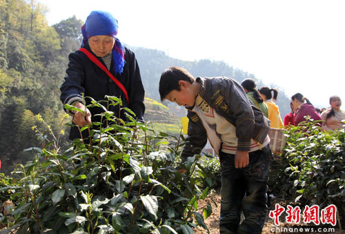 歙县属全国产茶大县,由于大量青壮年劳力外出务工,全县27万亩茶园、7600吨的茶叶采摘任务基本由留守老人、妇女和儿童承担,4月初以来,茶区15万名老人、妇女与节假日儿童活跃在青山绿水间。 吴建平 摄
