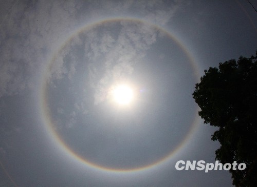 5月10日上午10时许,安徽九华山风景区上空出现难得一见的日晕天象奇观,太阳四周像是戴了“彩项圈”,引得众多海内外游客驻足观看。此次日晕现象持续时长近两小时。中新社发 程 昭 摄