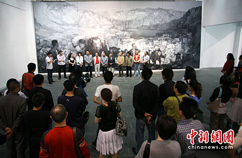 5月10日,四川籍画家廖真武纪念“5·12”汶川地震个人画展在四川大学拉开帷幕。此次画展由40幅作品组成,展出的绘画、雕塑以及纸面作品通过富有表现力的绘画技法、结构构图以及昏暗的灰色去记录所创主题,开展当天吸引了美国、成都、乐山、眉山等地市民以及四川大学学生近500余人观展。画展同步在北京开展,随后将前往上海、深圳等地展出。中新社发 刘忠俊 摄